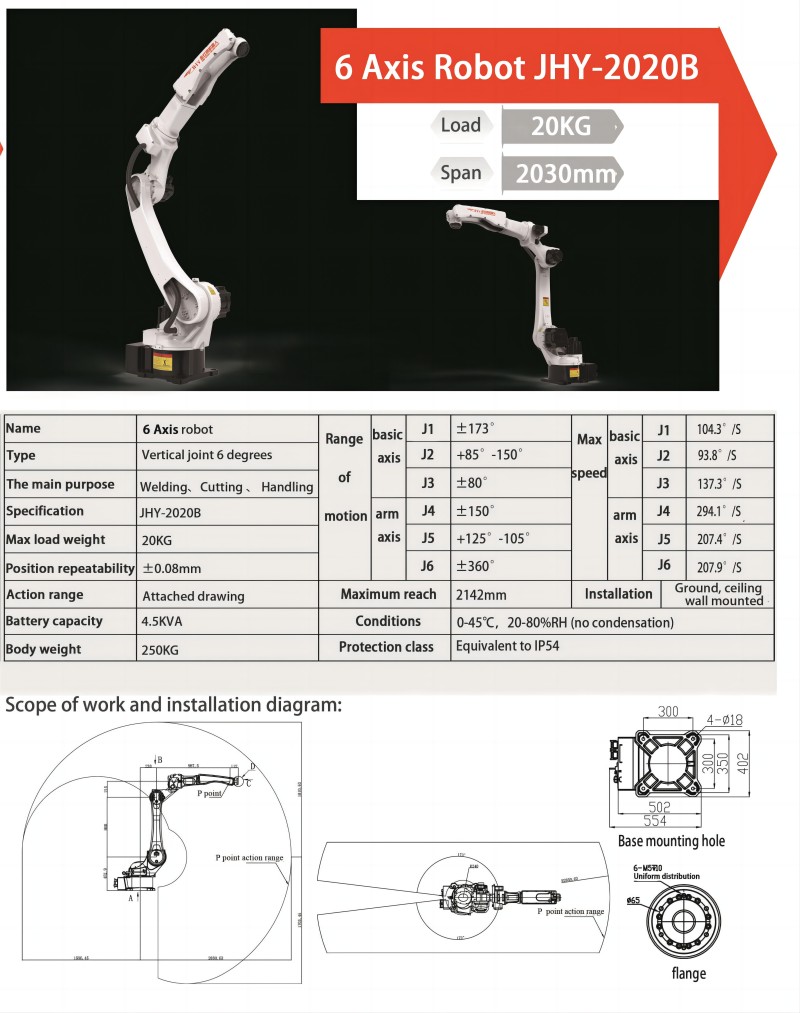 Multi-purpose robots are also known as multifunctional robots or multifunctional robotic arms. This is a 6-axis industrial robot with cutting and welding capabilities. This JHY multi-purpose robot has an arm length of 2 meters and a load capacity of 20KG. It features fast response, compact structure, flexible application, strong versatility, and easy maintenance, making it widely used.